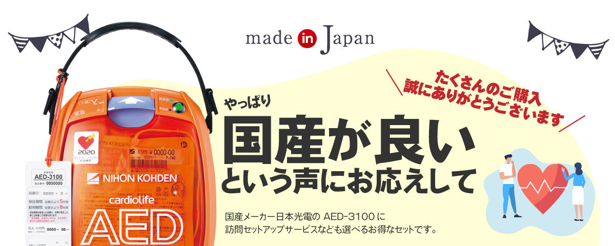 - AED-3100基本セット内容:AED自動体外式除細動器本体(5年間保証) 1台、キャリングケース(1個)、使い捨て除細動パッド(1枚 ※予備用のパッドは付属しません)、バッテリパック(1個)、レスキューキット(1個)、ポスター(A3サイズ)、AEDステッカー ( AED設置シール、A5サイズ(片面)、日常点検タグ、リモート監視端末(5年間)